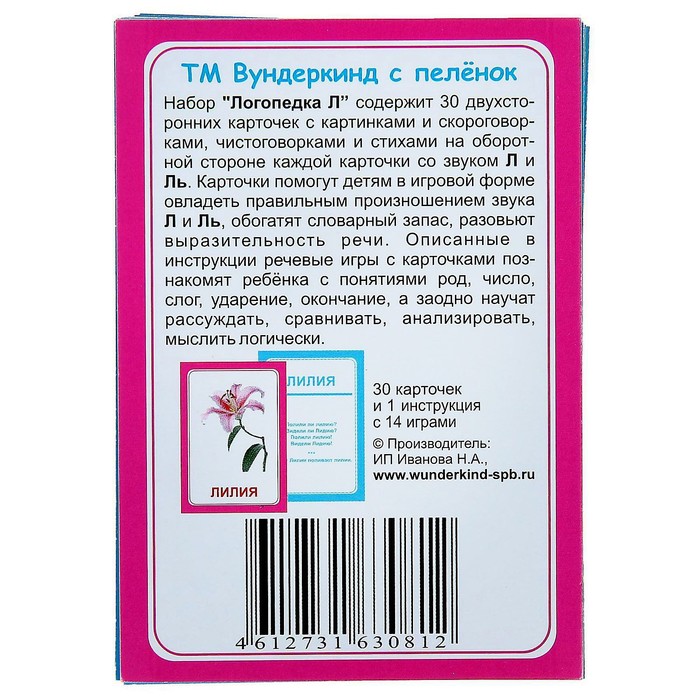 Набор состоит из 30 двусторонних логопедических карточек с картинками, скороговорками и стихами. Он поможет малышу в игровой форме овладеть правильным произношением звука «Л», расширить словарный запас и развить грамотную речь. Такие занятия познакомят ребёнка с понятиями «род», «слог», «ударение» и «окончание».