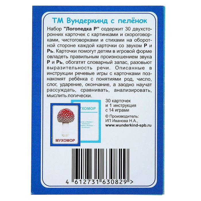 Набор состоит из 30 двусторонних логопедических карточек с картинками, скороговорками и стихами. Он поможет малышу в игровой форме овладеть правильным произношением звука «Р», расширить словарный запас и развить грамотную речь. Такие занятия познакомят ребёнка с понятиями «род», «слог», «ударение» и «окончание».