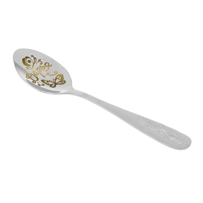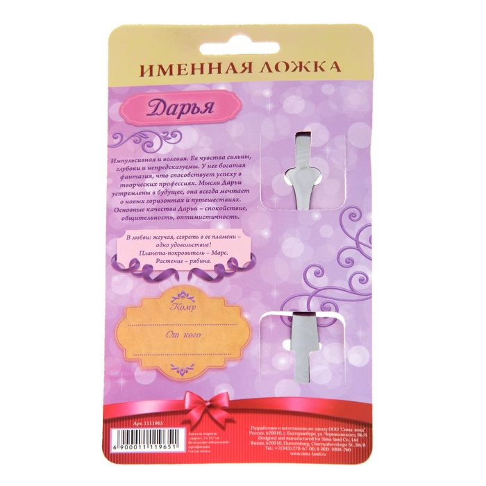 На черпаке у ложки лазерная надпись, а на рукоятке — изящный узор. На открытке, над дизайном которой трудилась команда настоящих профессионалов, нанесён стильный рисунок и характеристика имени.
