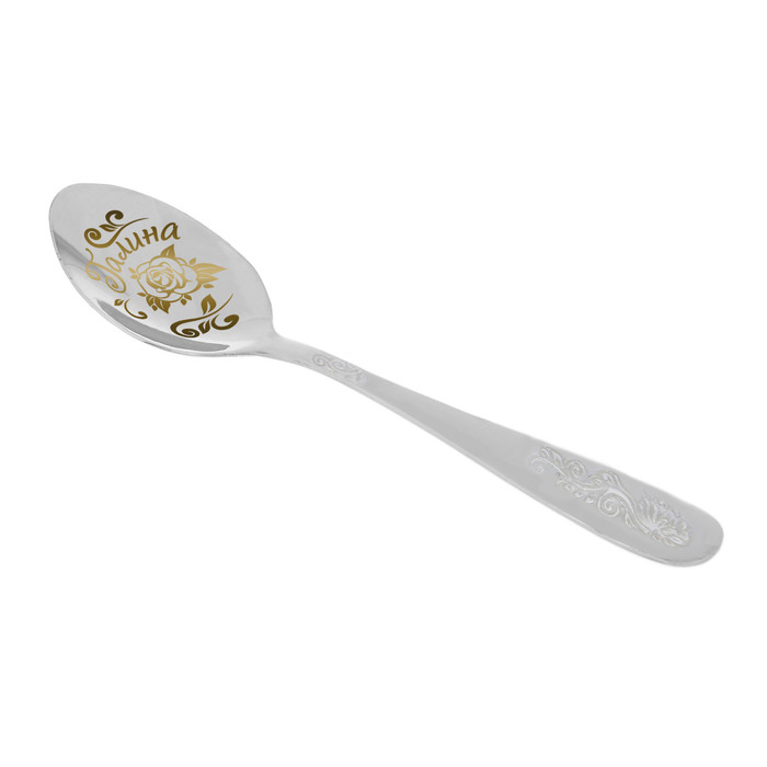 На черпаке у ложки лазерная надпись, а на рукоятке — изящный узор. На открытке, над дизайном которой трудилась команда настоящих профессионалов, нанесён стильный рисунок и характеристика имени.