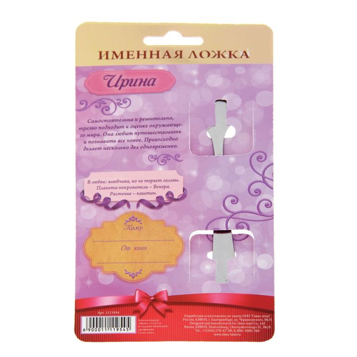 На черпаке у ложки лазерная надпись, а на рукоятке — изящный узор. На открытке, над дизайном которой трудилась команда настоящих профессионалов, нанесён стильный рисунок и характеристика имени.