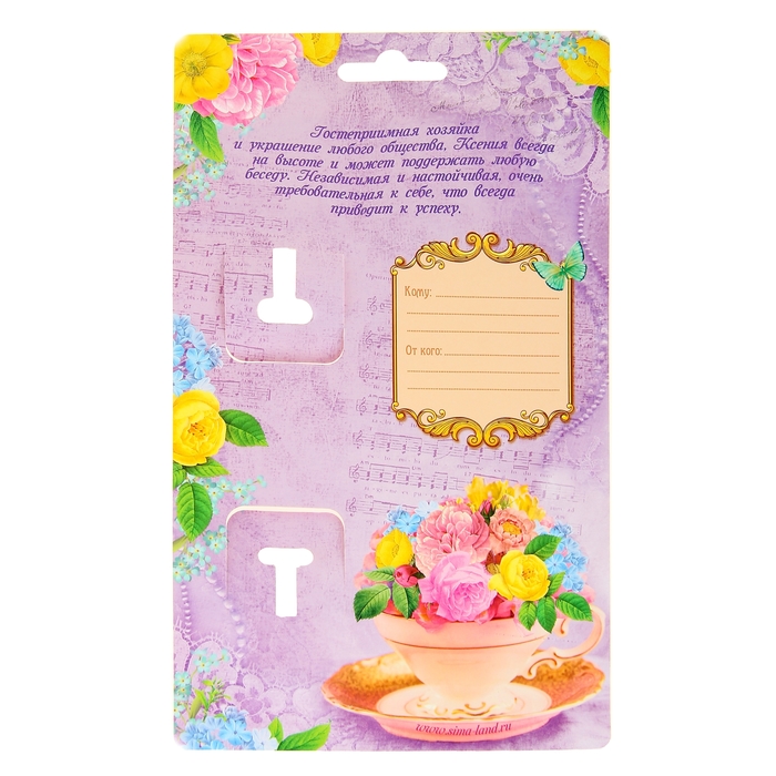 Именная ложка - это не только функциональный подарок на день рождения, профессиональный праздник или в любой другой день, но и оригинальный предмет интерьера. Надпись нанесена на черпак при помощи лазера, на рукоятке ложки – золотой узор. Дизайнерское оформление открытки позволит выбрать подарок по случаю и торжественно вручить его адресату.