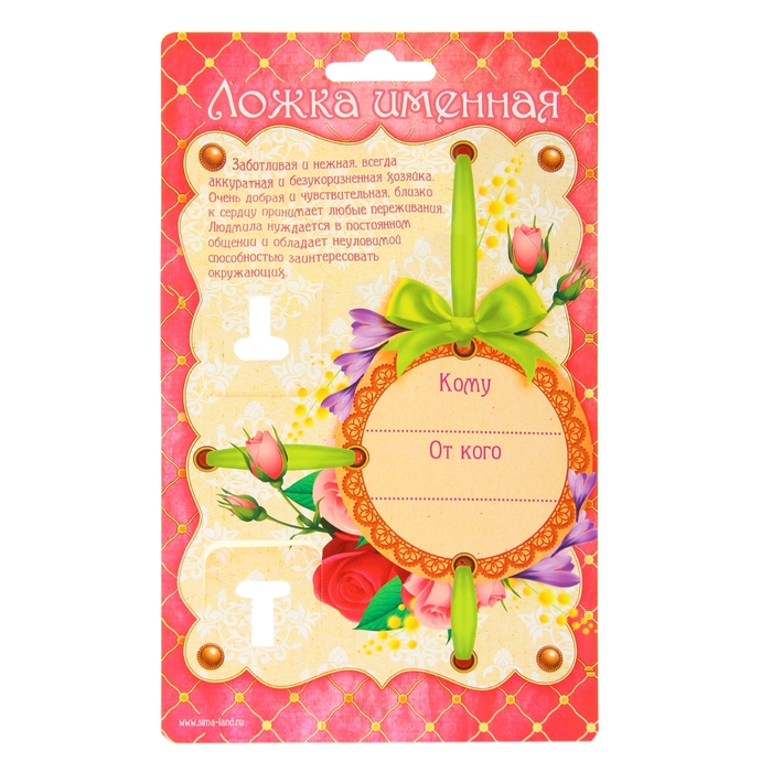 Именная ложка - это не только функциональный подарок на день рождения, профессиональный праздник или в любой другой день, но и оригинальный предмет интерьера. Надпись нанесена на черпак при помощи лазера, на рукоятке ложки – золотой узор. Дизайнерское оформление открытки позволит выбрать подарок по случаю и торжественно вручить его адресату.