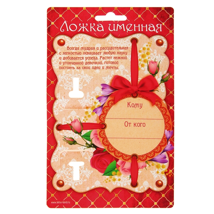 Именная ложка - это не только функциональный подарок на день рождения, профессиональный праздник или в любой другой день, но и оригинальный предмет интерьера. Надпись нанесена на черпак при помощи лазера, на рукоятке ложки – золотой узор. Дизайнерское оформление открытки позволит выбрать подарок по случаю и торжественно вручить его адресату.