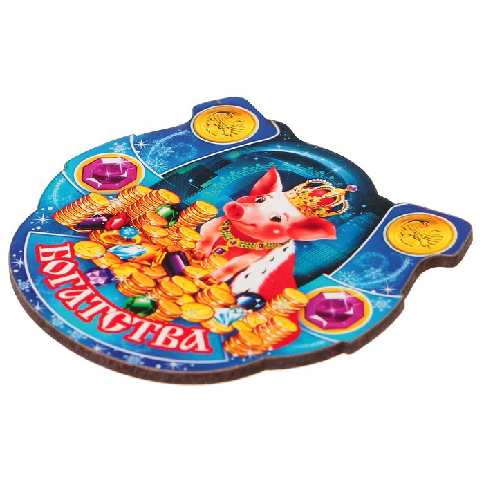 Магнит деревянный подкова "Богатства" с голографией, 7х7см, Символ года 2019