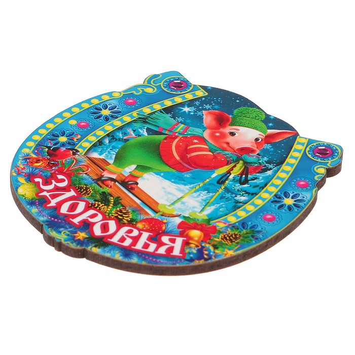 Магнит деревянный подкова "Здоровья" с голографией, 7х7см, Символ года 2019