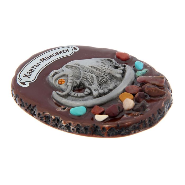 Магнит "Ханты-Мансийск" с россыпью натуральных камней состоит из акриловой подставки под яшму и металлической фигурки мамонта.