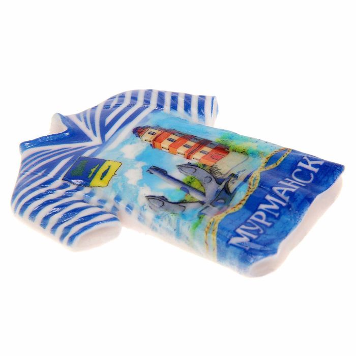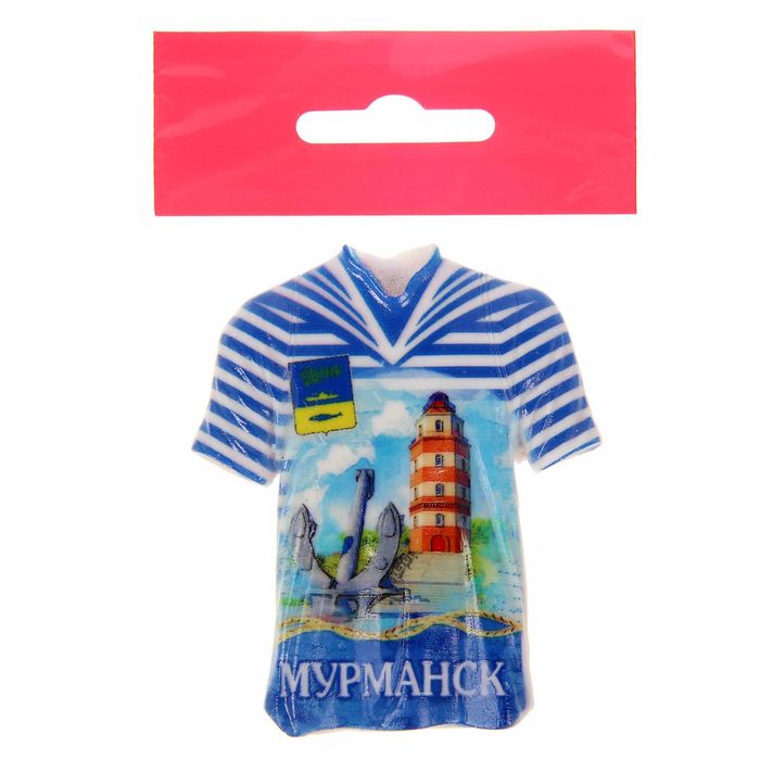 Сувенир выполнен в форме объёмной футболки. На нём изображён мемориал «Морякам, погибшим в мирное время» в Мурманске. Он свято хранит память о тех, кто с честью и отвагой нёс свою службу на благо Отечества. Имена храбрецов увековечены в летописи музея башни-маяка. Её видно с любой точки города. Суровый и непоколебимый, этот гордый страж олицетворяет собой собирательный образ русского солдата, ценой своей жизни защищавшего Родину.