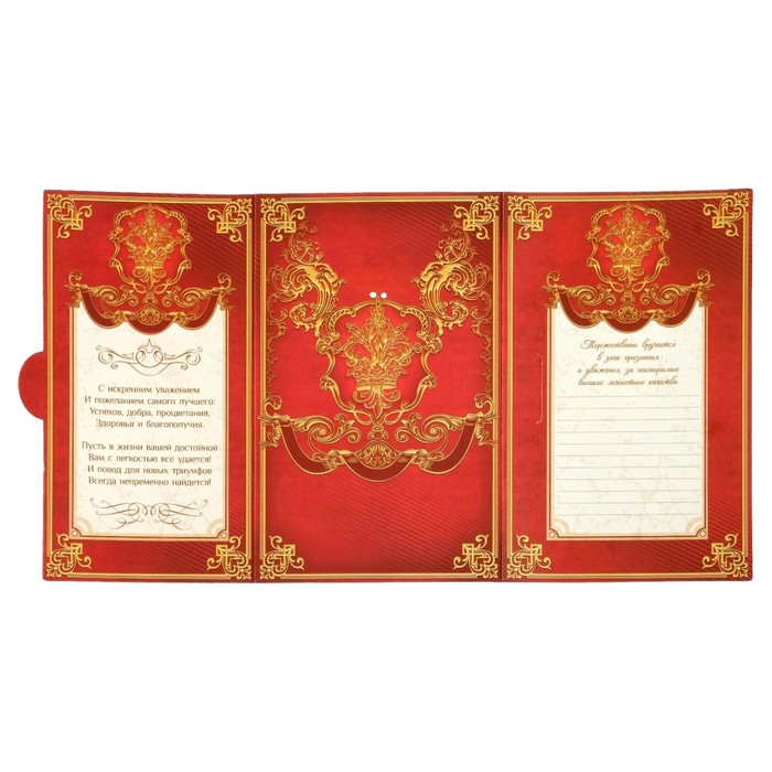 Награда аккуратно размещена на картонной подложке с поздравлением, наполненным тёплыми словами, и дополнена нарядной лентой.