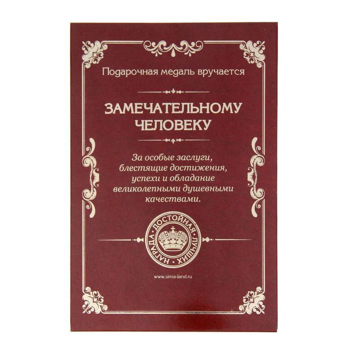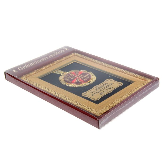 Металлическая медаль с яркой красной бляшкой упакована в подарочную упаковку из плотного картона, которая надёжно защищает изделие от повреждений. А ещё изделие в такой коробке будет выгодно смотреться на витрине в магазине.