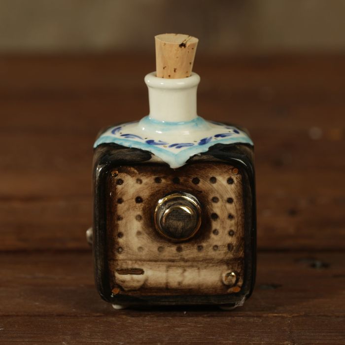 Оригинальный фарфоровый мини-штоф пригодится для хранения горячительного напитка. Кроме того, он будет замечательно смотреться в домашнем баре или буфете за стеклом с другой посудой.