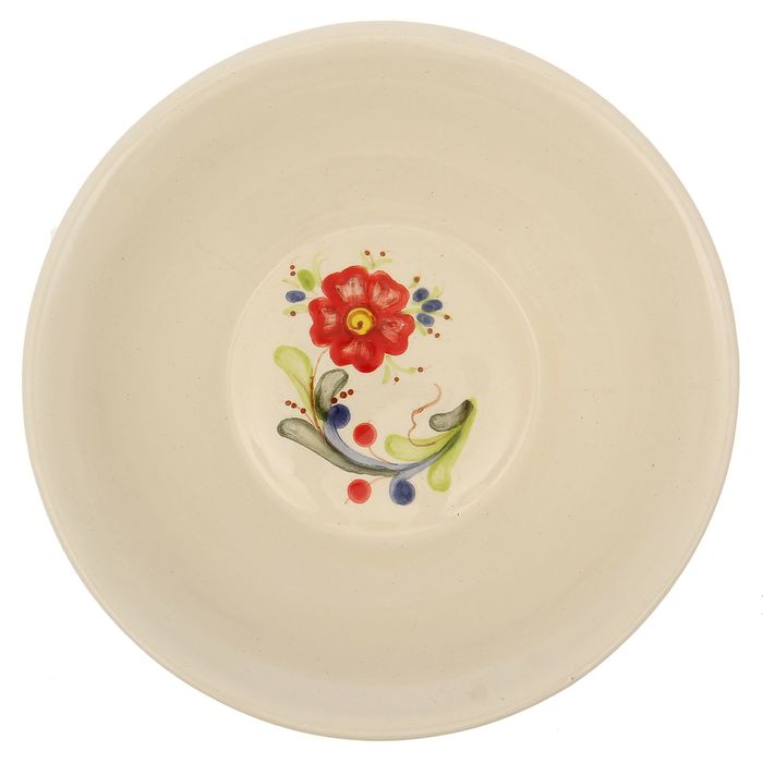 Такой салатник изготовлен из обожжённой глины с использованием расписной глазури. Посуда с ярким растительным орнаментом подойдёт для кухни в классическом или прованском стиле.