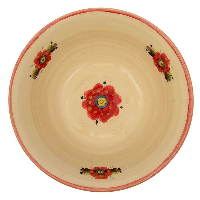 Такая тарелка изготовлена из обожжённой глины с использованием расписной глазури. Посуда с ярким растительным орнаментом подойдёт для кухни в классическом или прованском стиле.