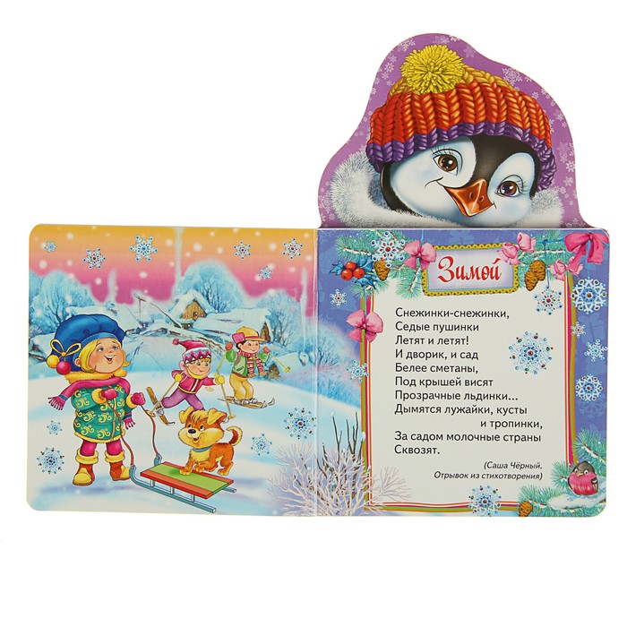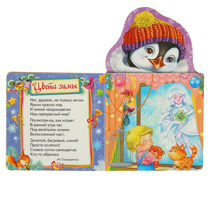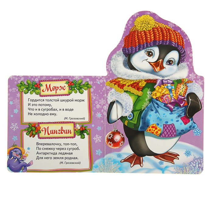 Уникальная новогодняя книга по привлекательной цене! Красочное издание с оригинальной фигурной вырубкой в виде пингвина. В книгу вошли стихи, посвященные зиме, зимним праздникам и обитателям самых холодных мест земли: "Зимой" Саши Черного, "Цвета зимы" и "Айсберг" Натальи Скороденко, "Морж" и "Пингвин" Михаила Грозовского.