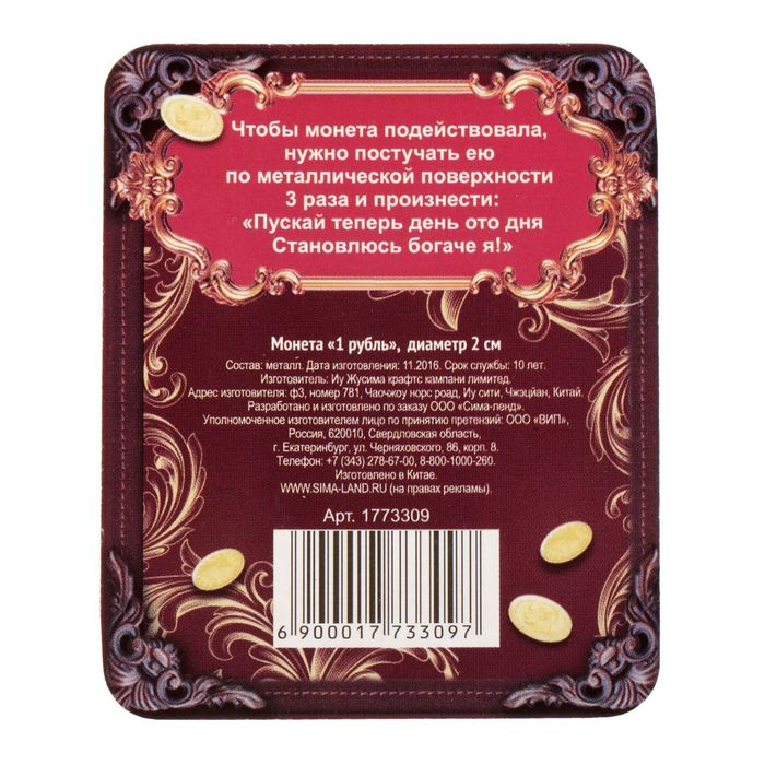 Чтобы всегда везло в денежных делах, монету можно положить в кошелёк – тогда он никогда не опустеет. Оригинальный сувенир и удачный подарок для каждого!