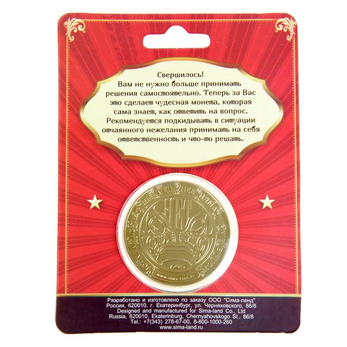 Сувенир изготовлен из яркого металла под золото, преподносится на яркой подарочной подложке. Каждая сторона имеет уникальный рисунок, который подскажет вам возможные варианты решения различных проблем. Станет достойным экземпляром любой коллекции.