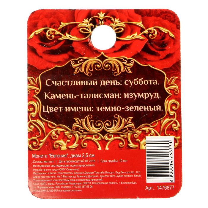 Монета изготовлена из металла и преподносится на яркой, красочной подложке с описанием атрибутов приносящих счастье.