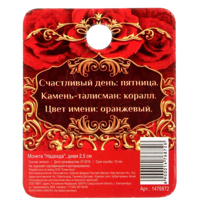 Монета изготовлена из металла и преподносится на яркой, красочной подложке с описанием атрибутов приносящих счастье.