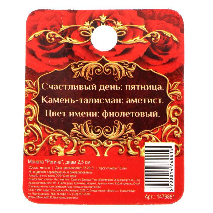 Монета изготовлена из металла и преподносится на яркой, красочной подложке с описанием атрибутов приносящих счастье.