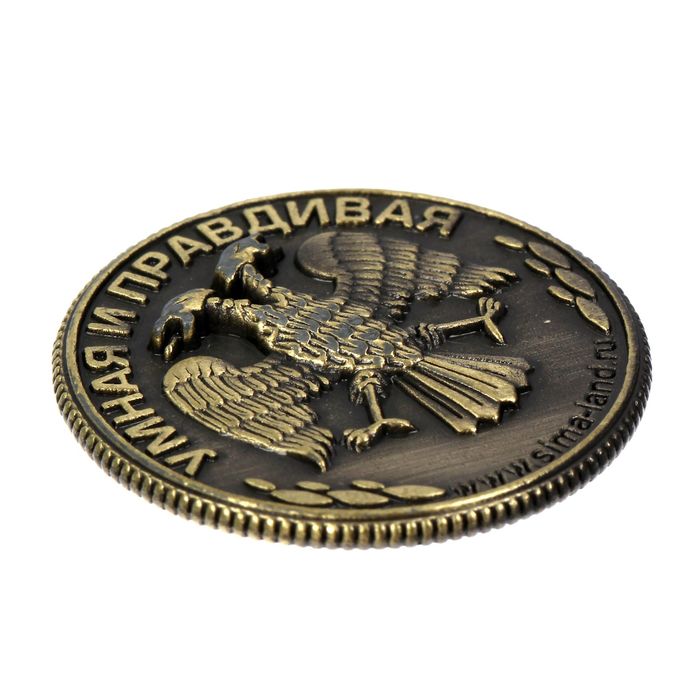 Монета изготовлена из металла и преподносится на яркой, красочной подложке с описанием атрибутов приносящих счастье.
