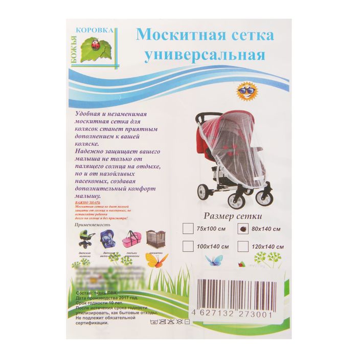 Универсальная москитная сетка убережёт малыша от укусов насекомых, тополиного пуха, яркого солнечного света и городской пыли. По периметру изделия пришита резинка, которая служит для фиксации.