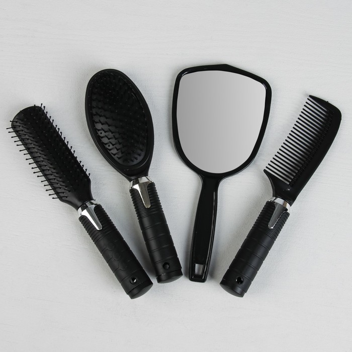 Набор 4 предмета: расчёска с ручкой, массажная, брашинг, зеркало, цвет чёрный/серебристый