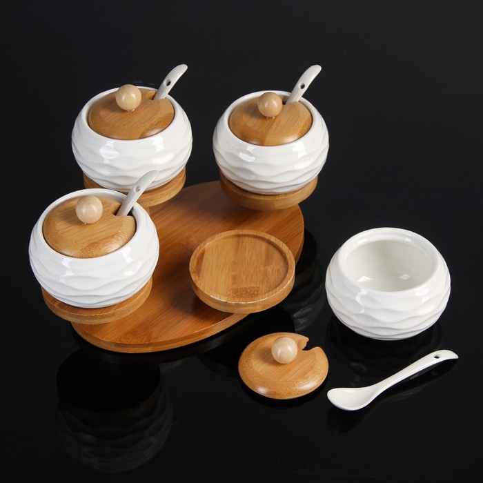 От качества посуды зависит не только вкус еды, но и здоровье человека. Набор банок для сыпучих продуктов 200 мл "Эстет. Гнездо", 4 шт, на деревянной подставке, 4 ложки — товар, соответствующий российским стандартам качества. Любой хозяйке будет приятно держать его в руках. С нашей посудой и кухонной утварью приготовление еды и сервировка стола превратятся в настоящий праздник.