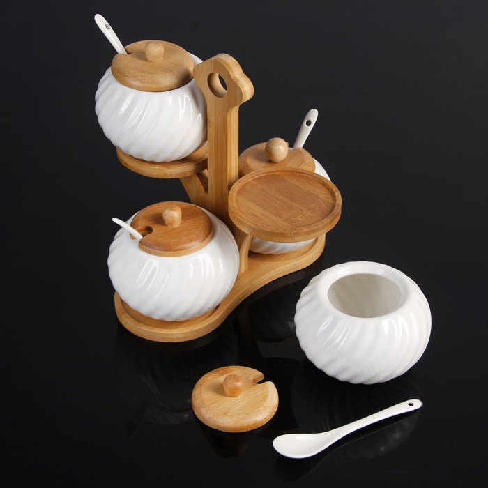 От качества посуды зависит не только вкус еды, но и здоровье человека. Набор банок для сыпучих продуктов 300 мл "Эстет. Волна", 4 шт, на деревянной подставке, 4 ложки — товар, соответствующий российским стандартам качества. Любой хозяйке будет приятно держать его в руках. С нашей посудой и кухонной утварью приготовление еды и сервировка стола превратятся в настоящий праздник.