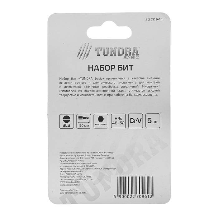 Стройте грандиозные планы, реализуйте свои идеи и не бойтесь знакомиться с новыми материалами и техниками. У вас всё получится, ведь у нас вы найдете инструмент как для бытового использования, так и для профессиональной деятельности. Может быть, Набор бит TUNDRA basic, сталь CrV, 5 шт, 50 мм, SL6 — это именно то, что вы всегда искали.