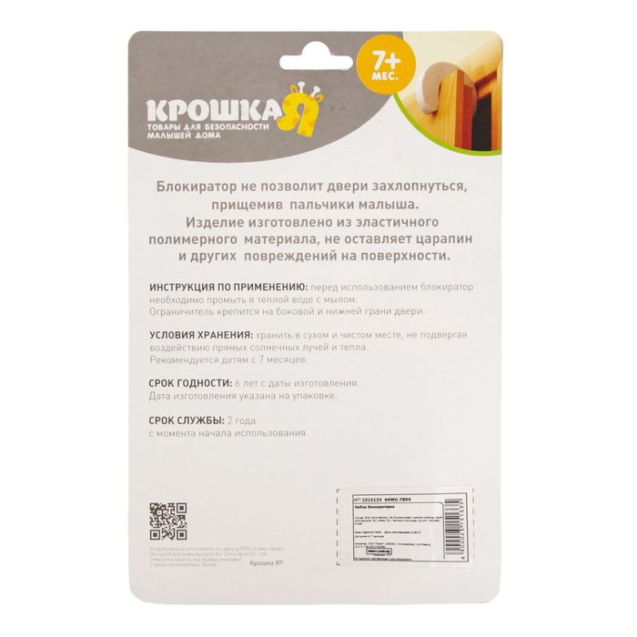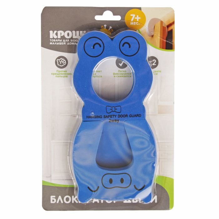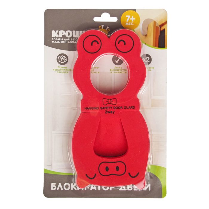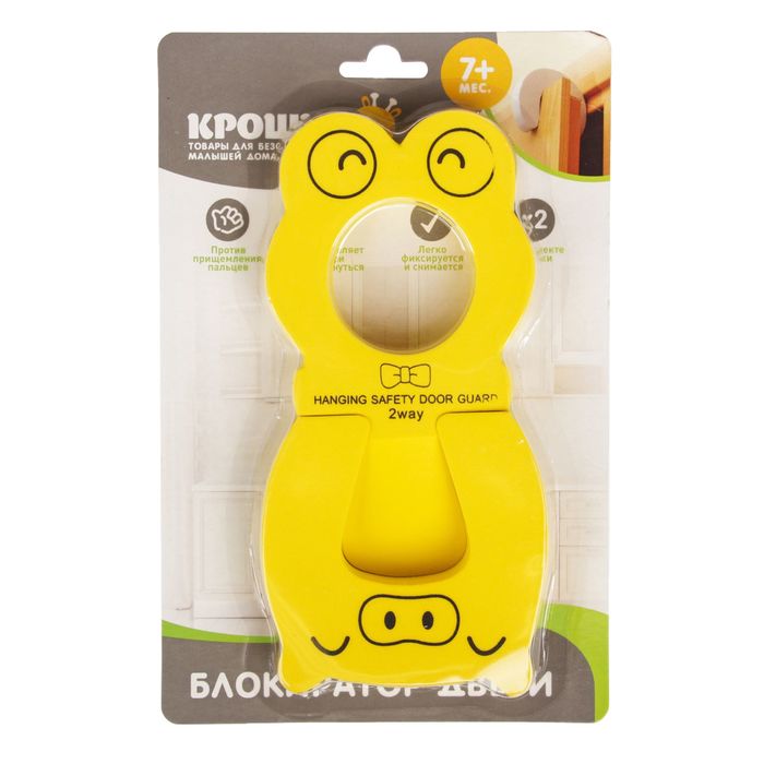 Данная модель убережёт малютку от случайного прищемления пальчиков. Одна часть приспособления кладётся на пол под дверь и фиксирует её положение. Вторая половинка в форме подковы крепится на боковой грани. Изделие выполнено в виде забавных зверят, поэтому прекрасно подойдёт для использования в детской комнате.