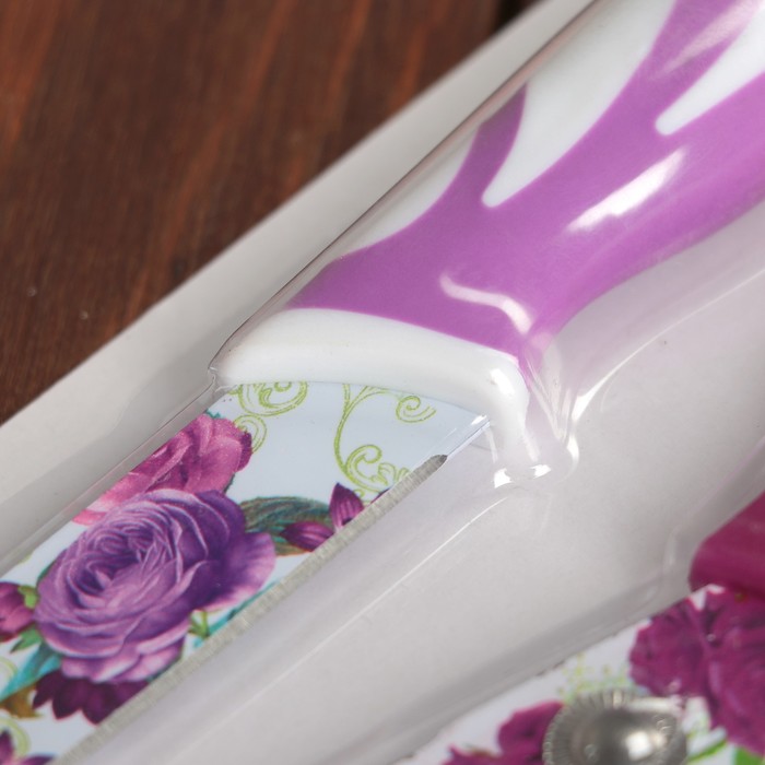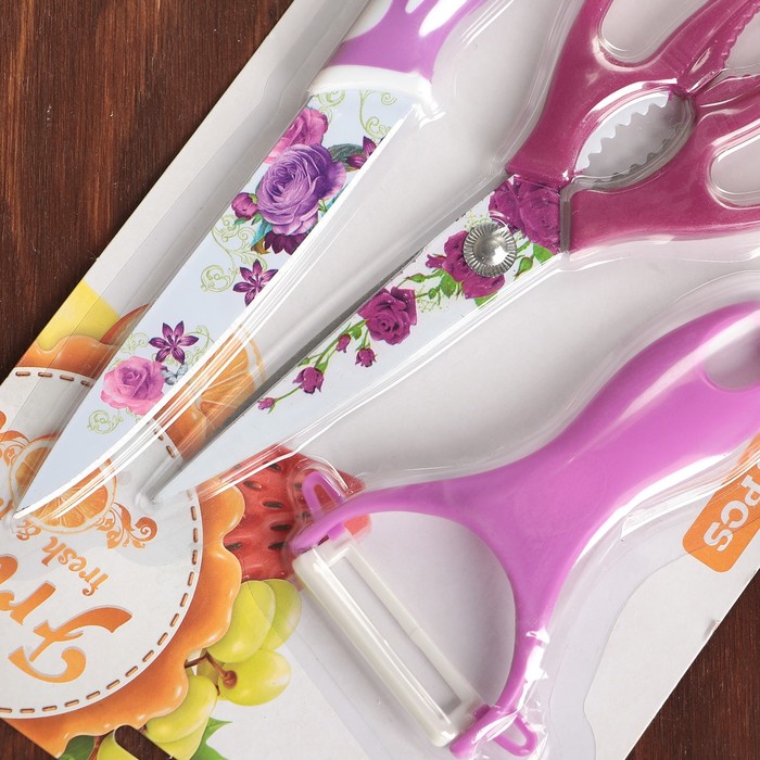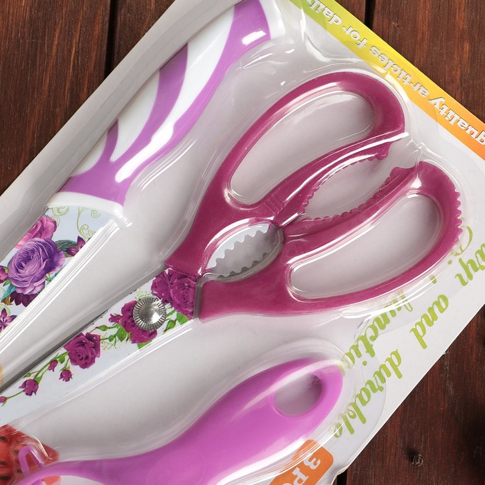 Набор "Цветение", 3 предмета: нож 12,5 см, ножницы, овощечистка 28х18х1 см, цвет фиолетовый