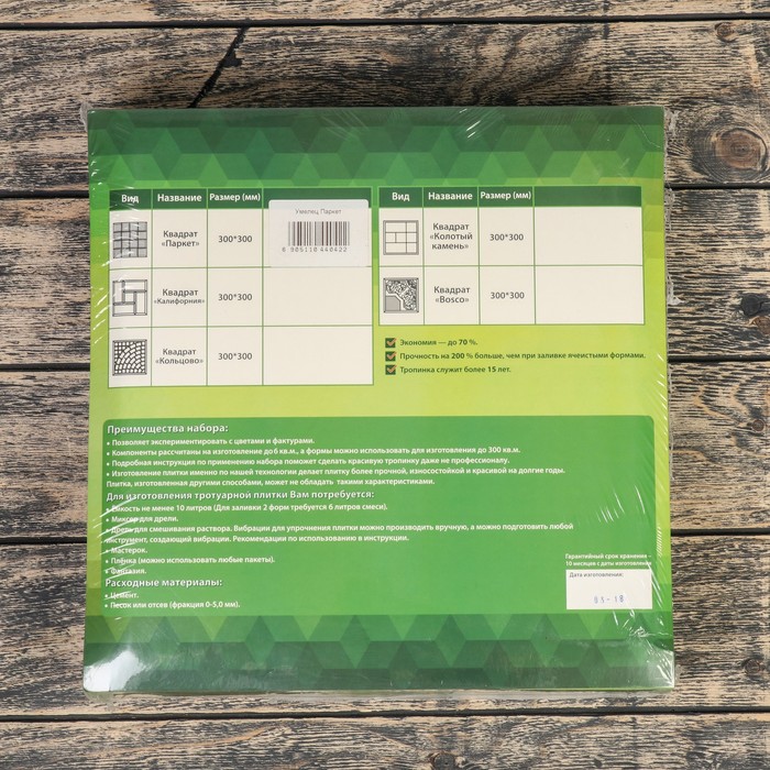 Кроме этого, вам понадобится цемент и песок. Количество компонентов в наборе рассчитано на изготовление до 6 кв. м плитки. А прочные пластиковые формы выдержат 1,5 тысячи заливок каждая.