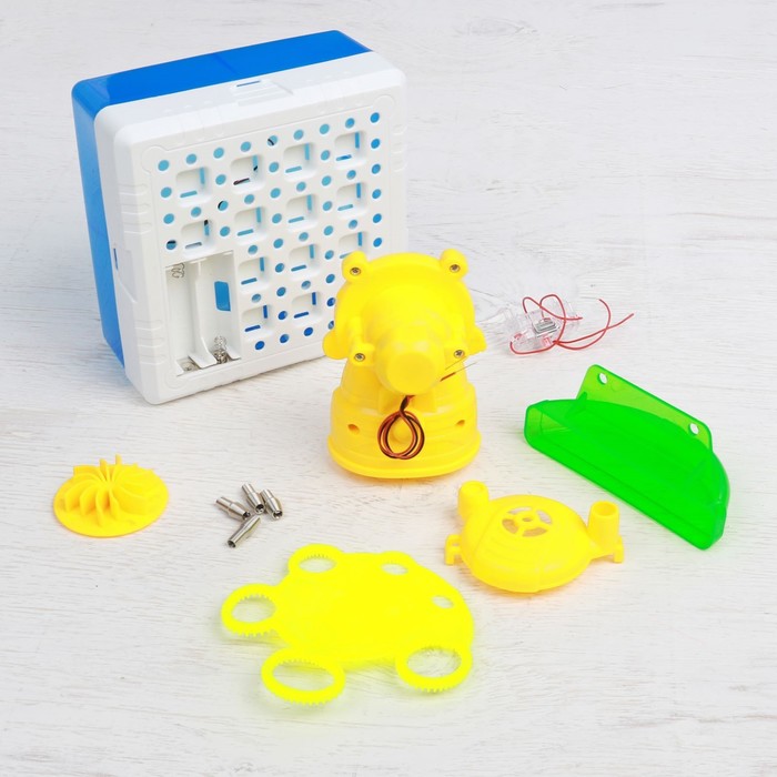 Соедините крутящийся блок с вентилятором, следуя указаниям инструкции. Поставьте контейнер для мыльной основы на базу с отверстиями. Подключите провода. Нажмите на кнопку включателя и наслаждаетесь появлением мыльных пузырей.