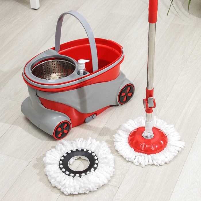 Набор для уборки: швабра, ведро на колесах с металлической центрифугой, запасная насадка