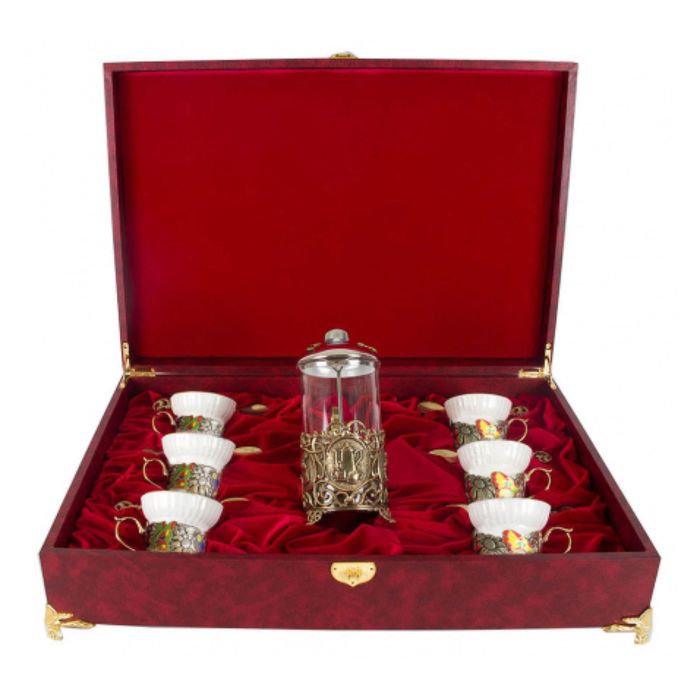 Набор из шести чашек с френч-прессом «Бабочки и цветы» в большой шкатулке