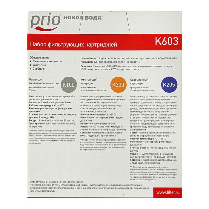 Набор картриджей Prio "Новая Вода" К603, для Е300, Е310, в комплект входит К100, К205, К300 351503
