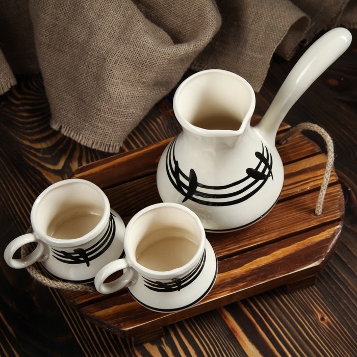 Все предметы набора изготовлены вручную из керамики. Этот экологически чистый материал легко переносит высокие и низкие температуры, устойчив к царапинам, потёртостям, не имеет запахов и примесей. Керамическая посуда хорошо держит тепло напитка, не влияя на его вкус.