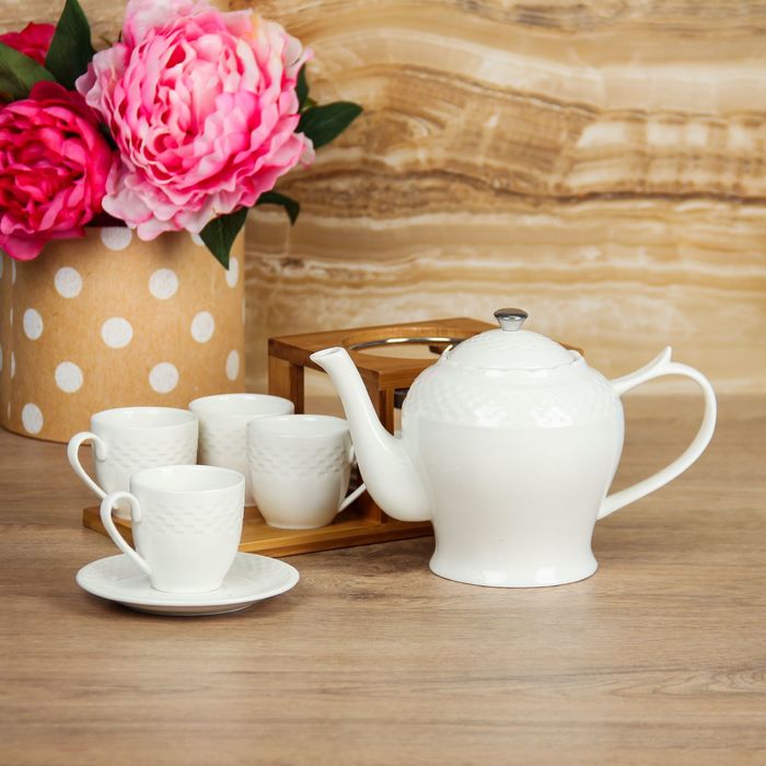 Керамический сервиз станет украшением праздничного стола. Белоснежные чайник, чашки и блюдца классической формы декорированы элегантным узором. Такая посуда гармонично дополнит любой вариант традиционной сервировки стола. У чайника имеется подставка для подогрева: благодаря ей вы можете сохранять напиток горячим на протяжении долгого времени.