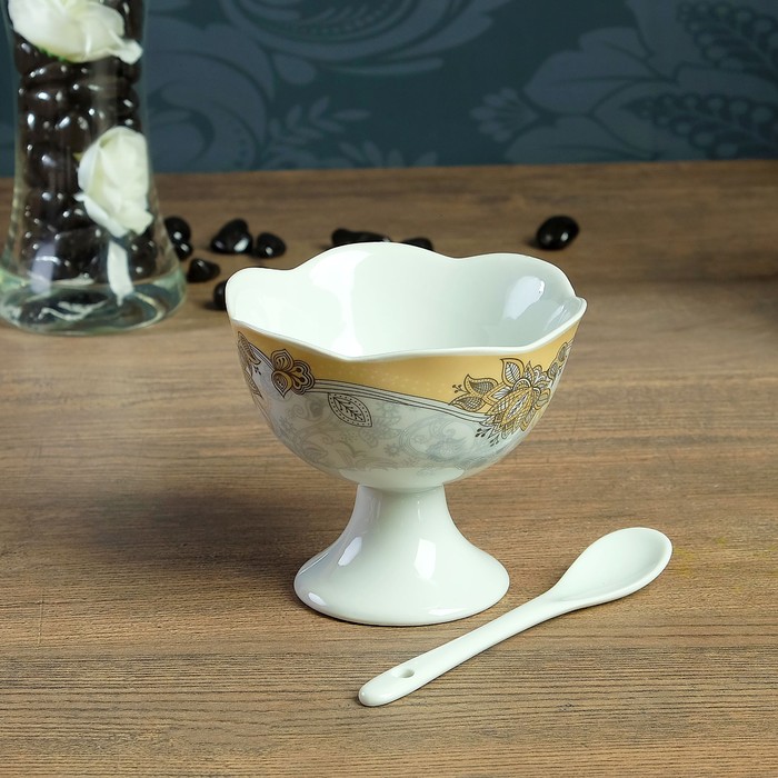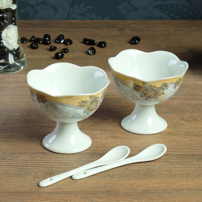 Набор креманок с ложками, креманки 2 шт 10×8.5, 0,2 л, ложки 2 шт 12×2 см, каменная керамика 38890
