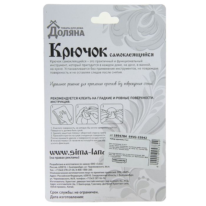 | Вид крючка | Самоклеящийся |
