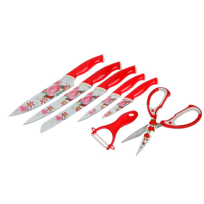 Набор кухонный "Цветение", 7 предметов на подставке: 5 ножей 8,5/12,5/20/20/20 см, овощечистка, ножницы, цвет МИКС