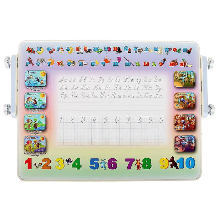 На поверхность мебели нанесены цифры, времена года, части суток и русский алфавит, иллюстрированный ассоциативными картинками. В процессе игры малыш запомнит, как пишутся буквы и числа, и попробует самостоятельно вывести на доске первые слова. Основа столешницы предназначена для письма маркерами, поэтому легко очищается влажной губкой.