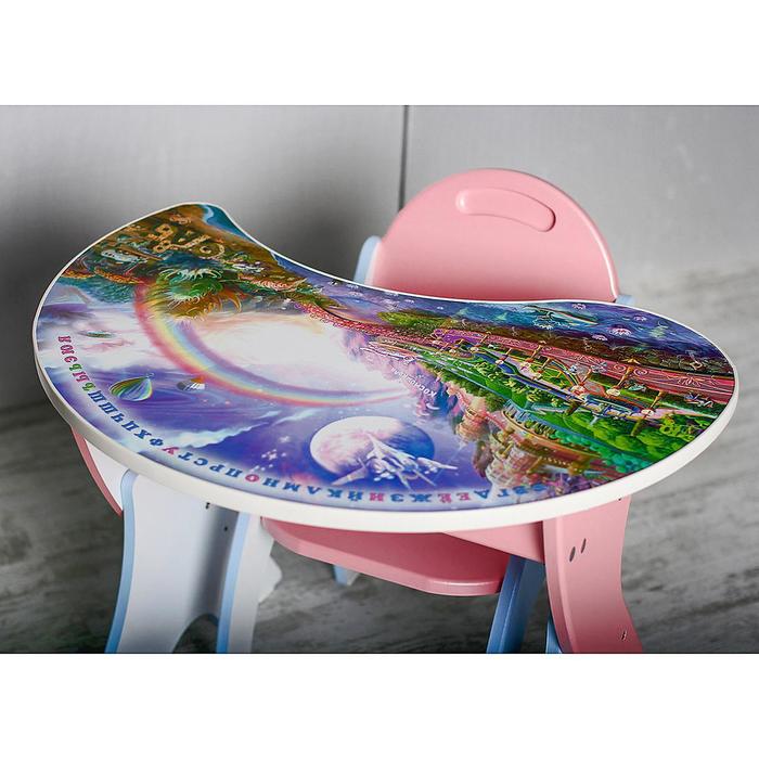На столешницу нанесена красочная аппликация, ребёнок дополнит рисунок водными маркерами, а после без труда сотрёт его с поверхности влажной губкой. Для удобства чада парта оснащена полочкой для хранения альбомов, тетрадей и карандашей, которые могут понадобиться в любой момент.