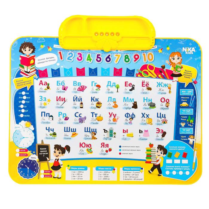 На столешнице есть русский алфавит с ассоциативными картинками, меры длины и массы, правила русского языка, цифры от 1 до 10 и множество увлекательных заданий: