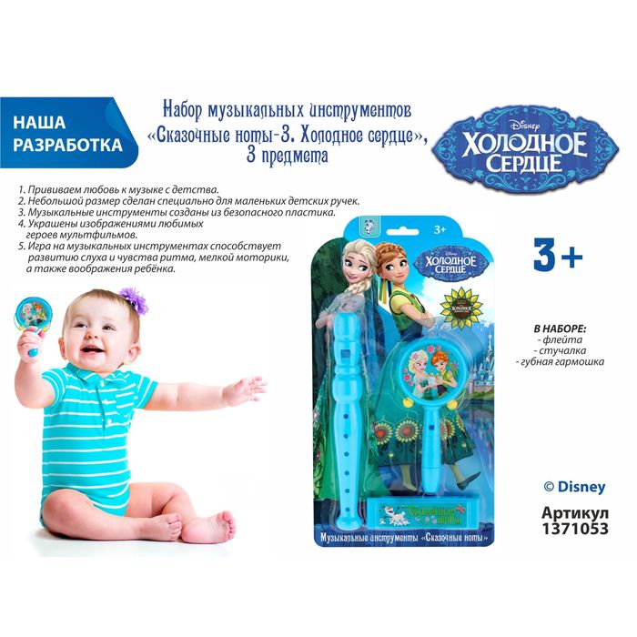 Флейта, барабан-стучалка и губная гармошка с изображениями героев мультфильма «Холодное сердце» будут стимулировать начинающих музыкантов к творчеству, развивать слух, чувство ритма, координацию движений и мелкую моторику детских ручек.