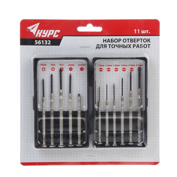 Набор отверток "КУРС", для точных работ, 11 шт., металл. рукоятка, PH00-1, SL1-3