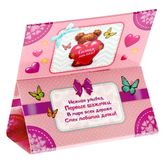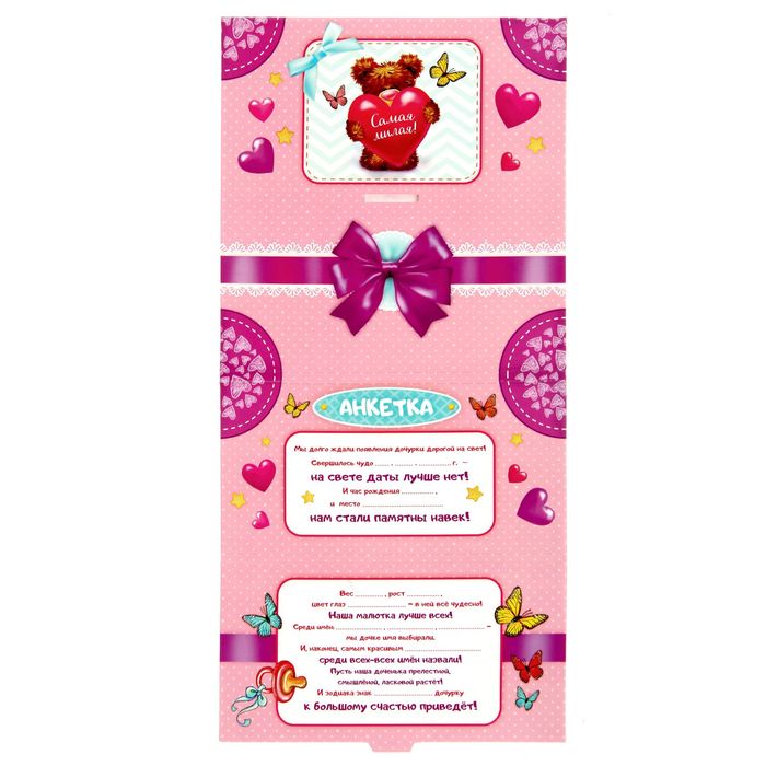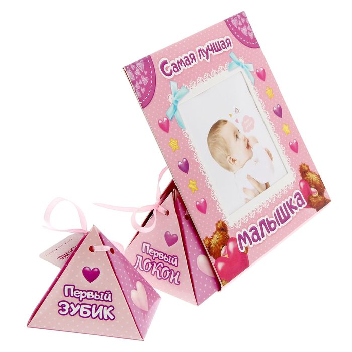 С таким подарочным набором счастливые мама и папа сохранят первые вехи в жизни своего ангелочка: первый локон, первый зубик и даже бирочку из роддома! Обратная сторона фоторамки дополнена анкетой малыша, а в её треугольном разъёме можно хранить милые коробочки с сокровищами. Каждая из них завязывается на ленточку, а внутри спрятан чудесный стишок. К каждой прилагается бирка, чтобы записать время и число, когда родители положили на хранение драгоценный предмет.