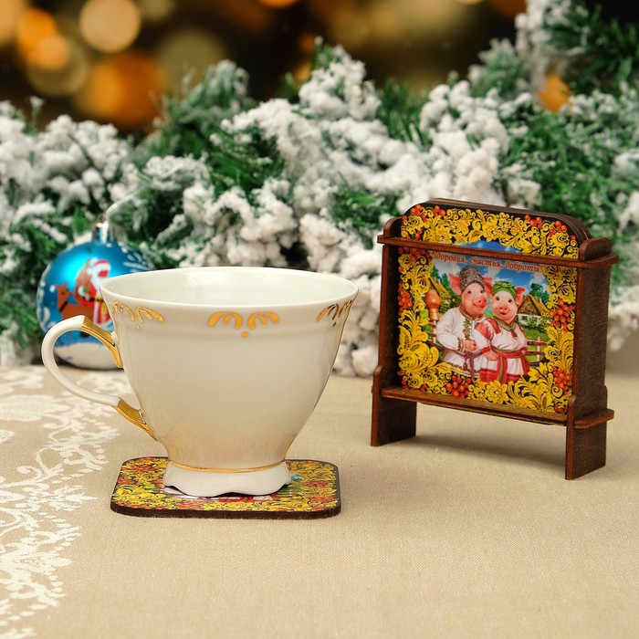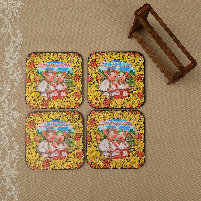 Набор подставок под горячее «Свинки», хохлома, 4 шт, 9×9 см