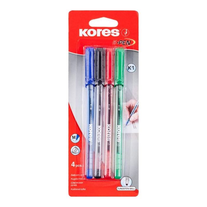 Набор ручек шариковых микс 4 цв. KORES К1 0.7мм (пишет 2.5км) ,треуг.корпус поможет организовать ваше рабочее пространство и время. Востребованные предметы в удобной упаковке будут всегда под рукой в нужный момент.