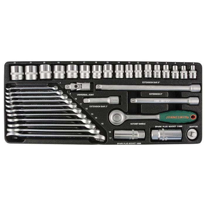 - торцевые головки, 17 шт. (6, 7, 8, 9, 10, 11, 12, 13, 14, 15, 16, 17, 18, 19, 20, 21, 22 мм);